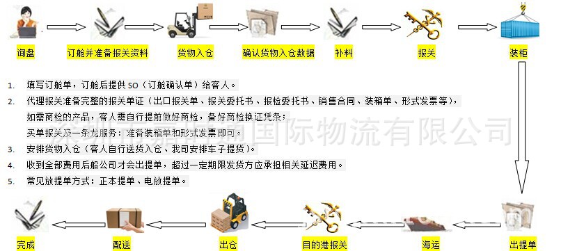 办事项目:订舱租船、仓储、安全、拖车、报关、运输、清关、配送
